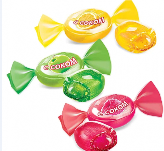 леденцовая карамель с начинкой из натурального сока малины, яблока и лимона. Каждая конфета имеет индивидуальную упаковку.